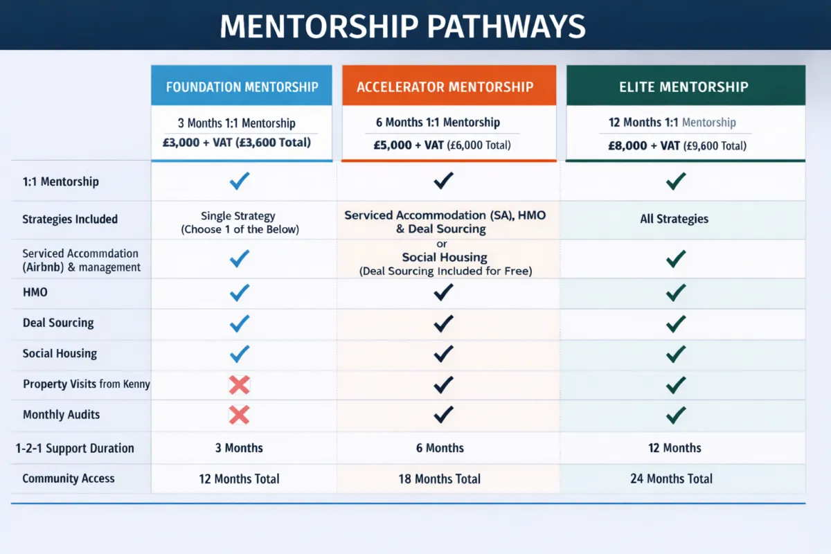 You’ll choose one strategy (HMO, SA, Social Housing, or Deal Sourcing) based on your lifestyle, budget, and goals. We’ll help you make the right choice in Week 1.